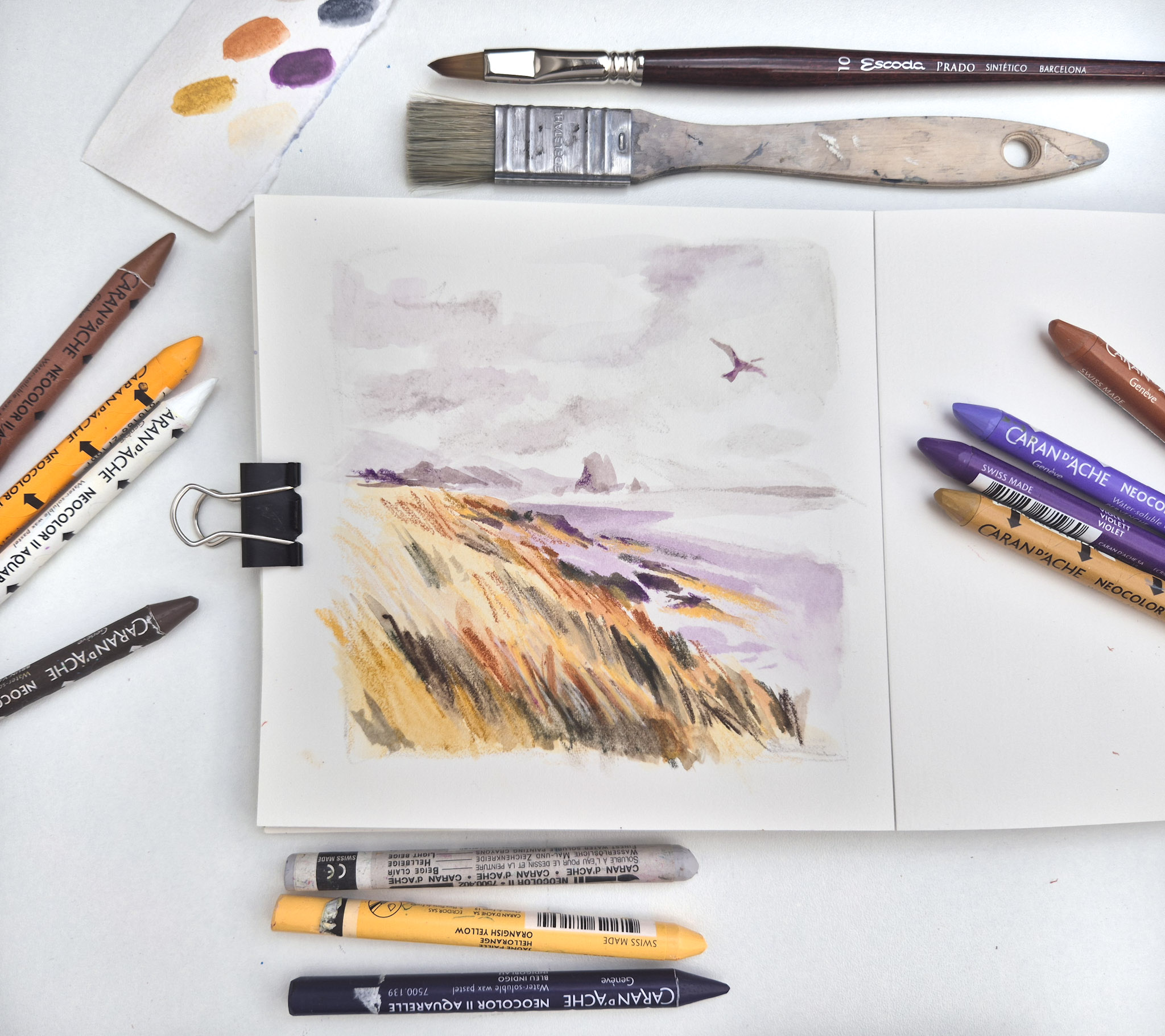Apprenez à réaliser des paysages simples à l’aide de pastels aquarellables, matériel compact et adapté à cette pratique.