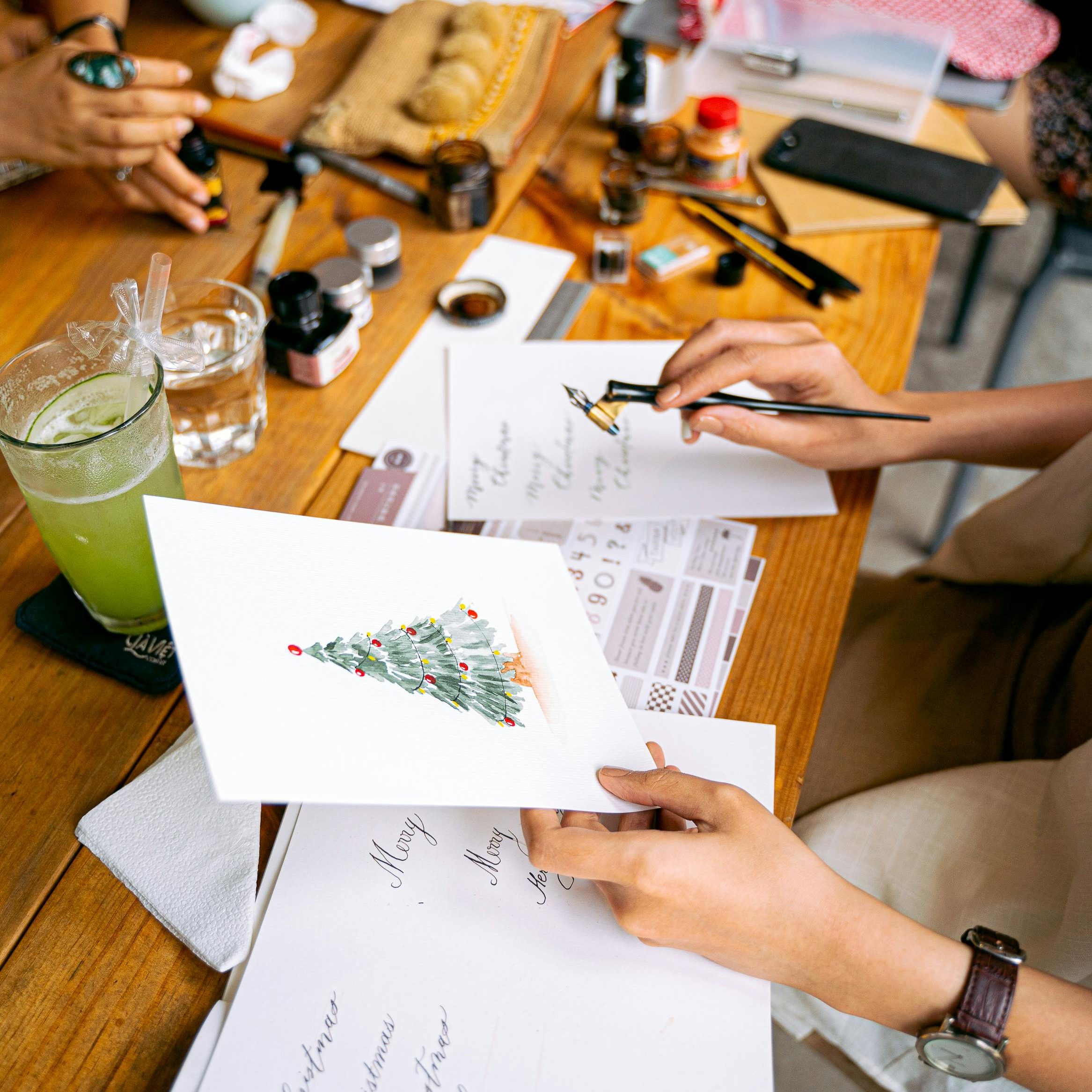 Découvrez l’aquarelle en réalisant votre papeterie de Noël (carte, marque-page, enveloppe,…) à offrir au moment des fêtes. Petits snacks salés et bulles au programme 🥂