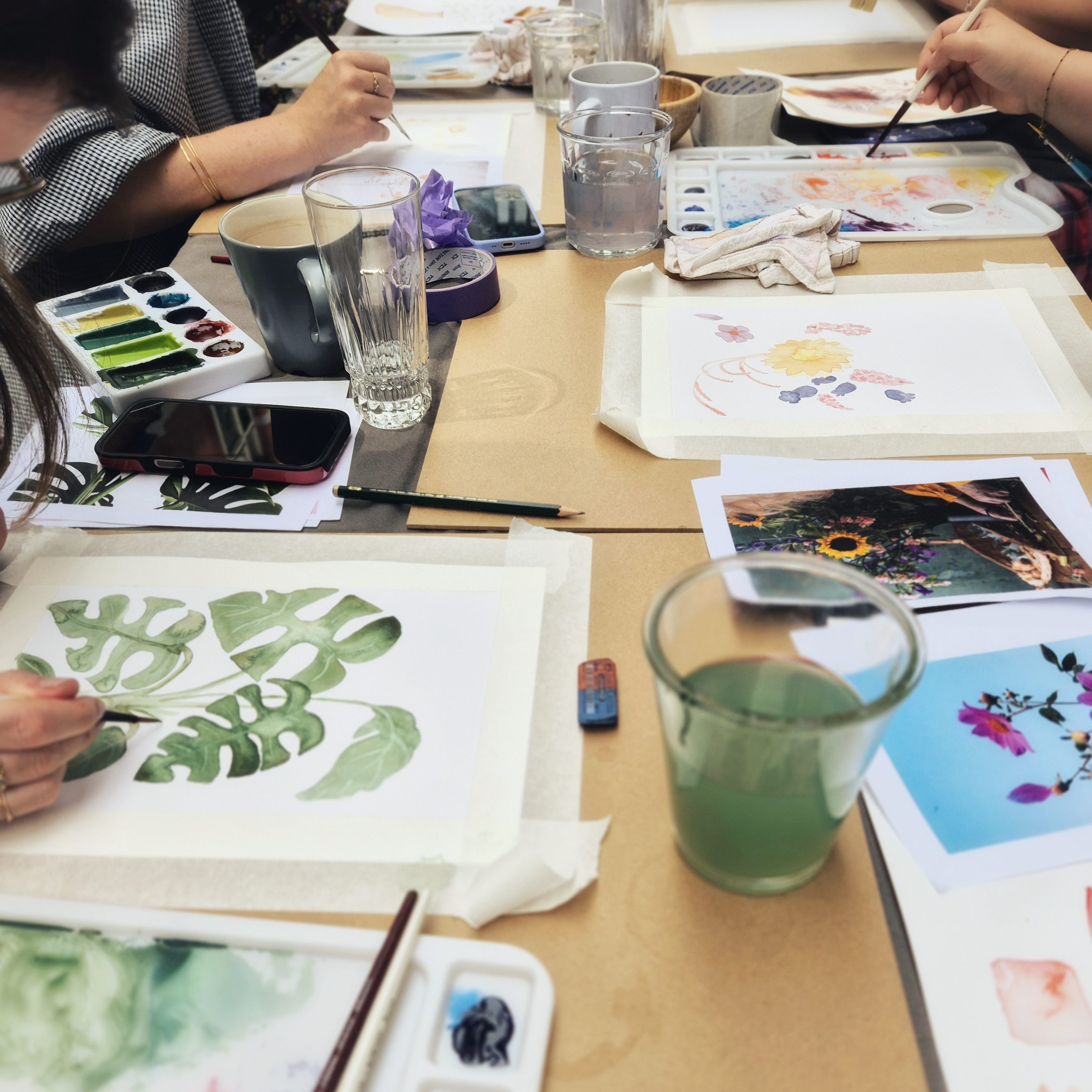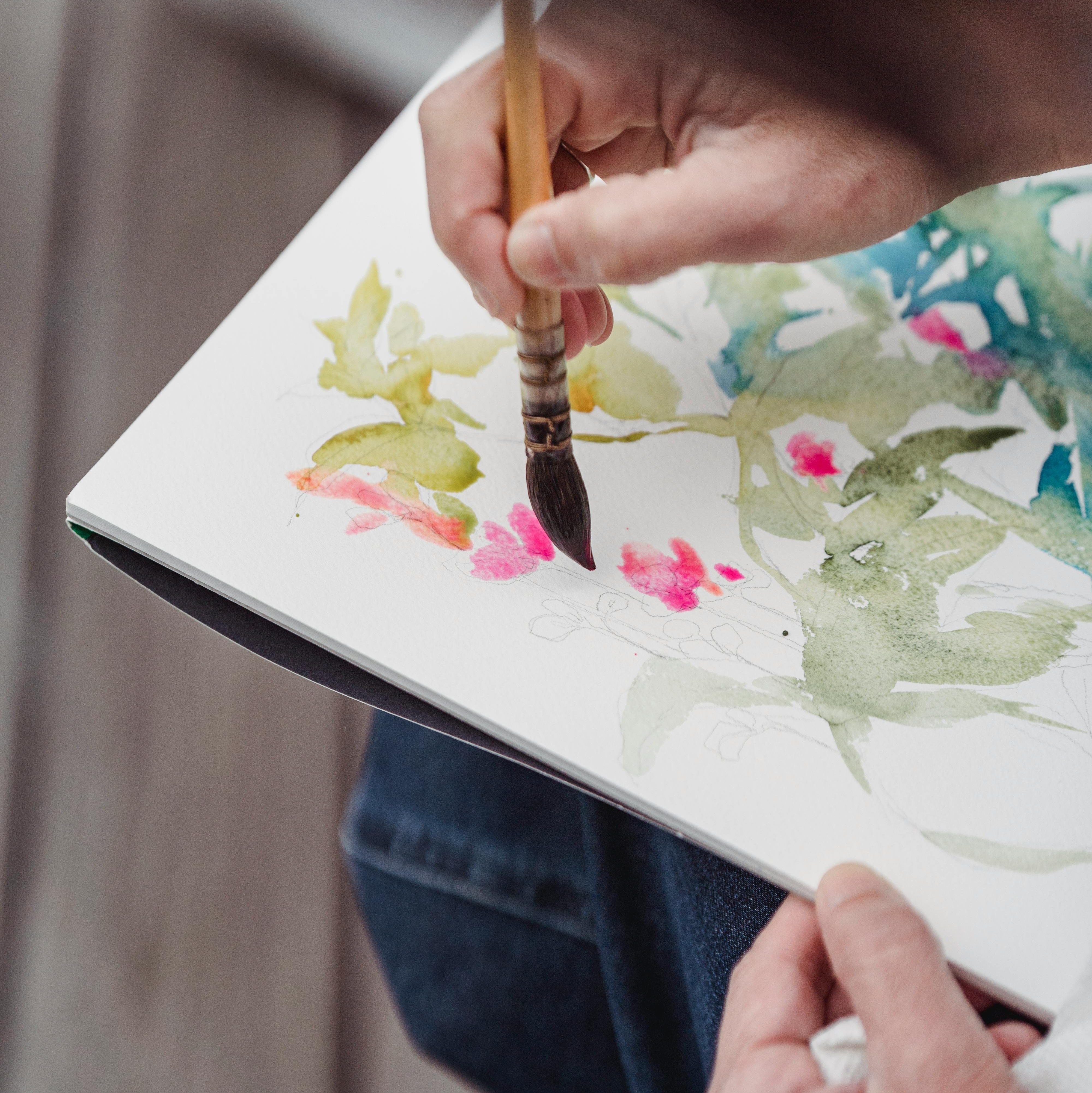 Les ateliers permettent non seulement de se perfectionner à l’aquarelle, mais aussi de découvrir et d’expérimenter d’autres médiums et techniques associées. Parmi les thématiques et techniques que nous explorons lors des séances hebdomadaires :